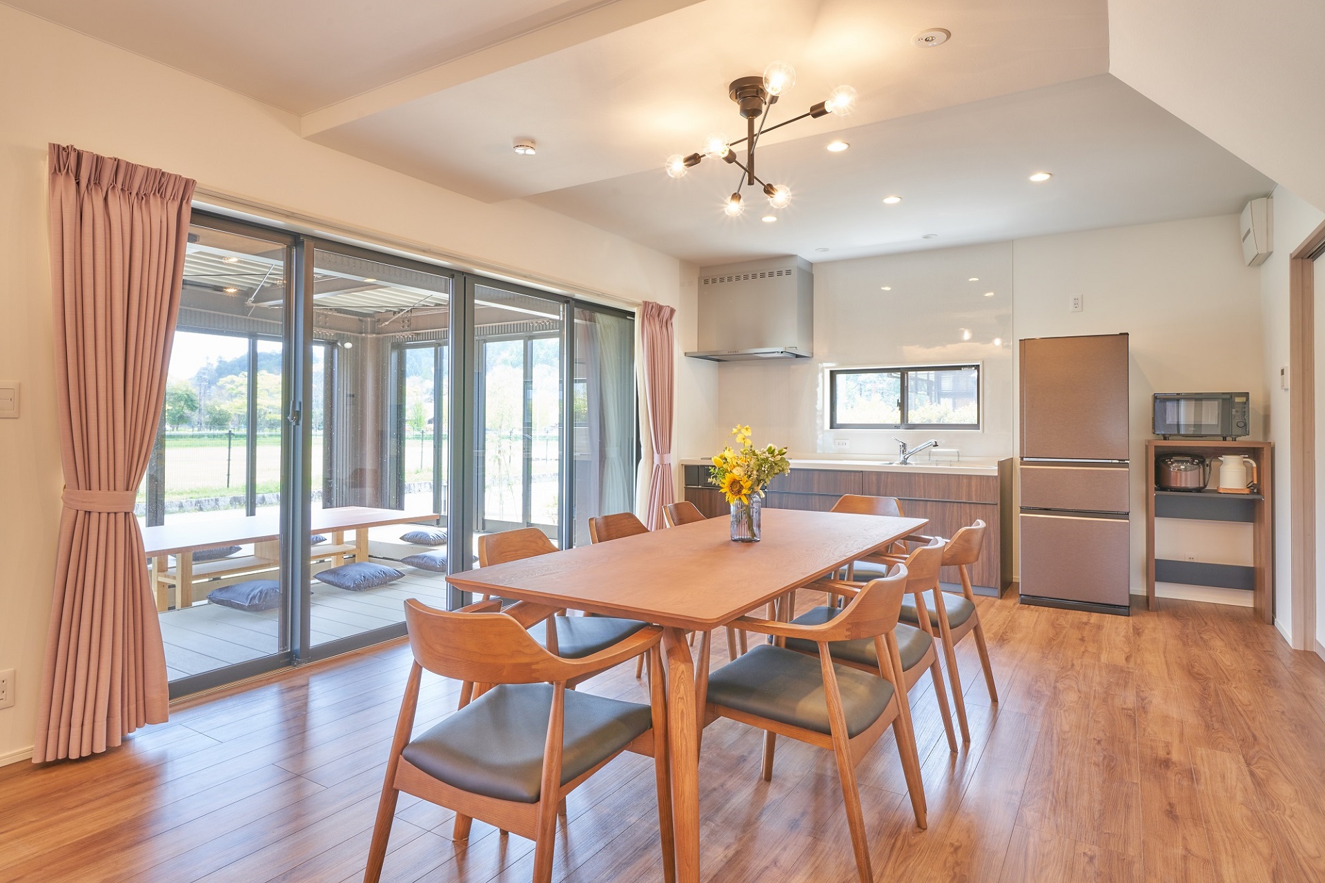 テラス側には掘りごたつ式のテーブルがあり、雨が降っても室内で BBQが楽しめます。