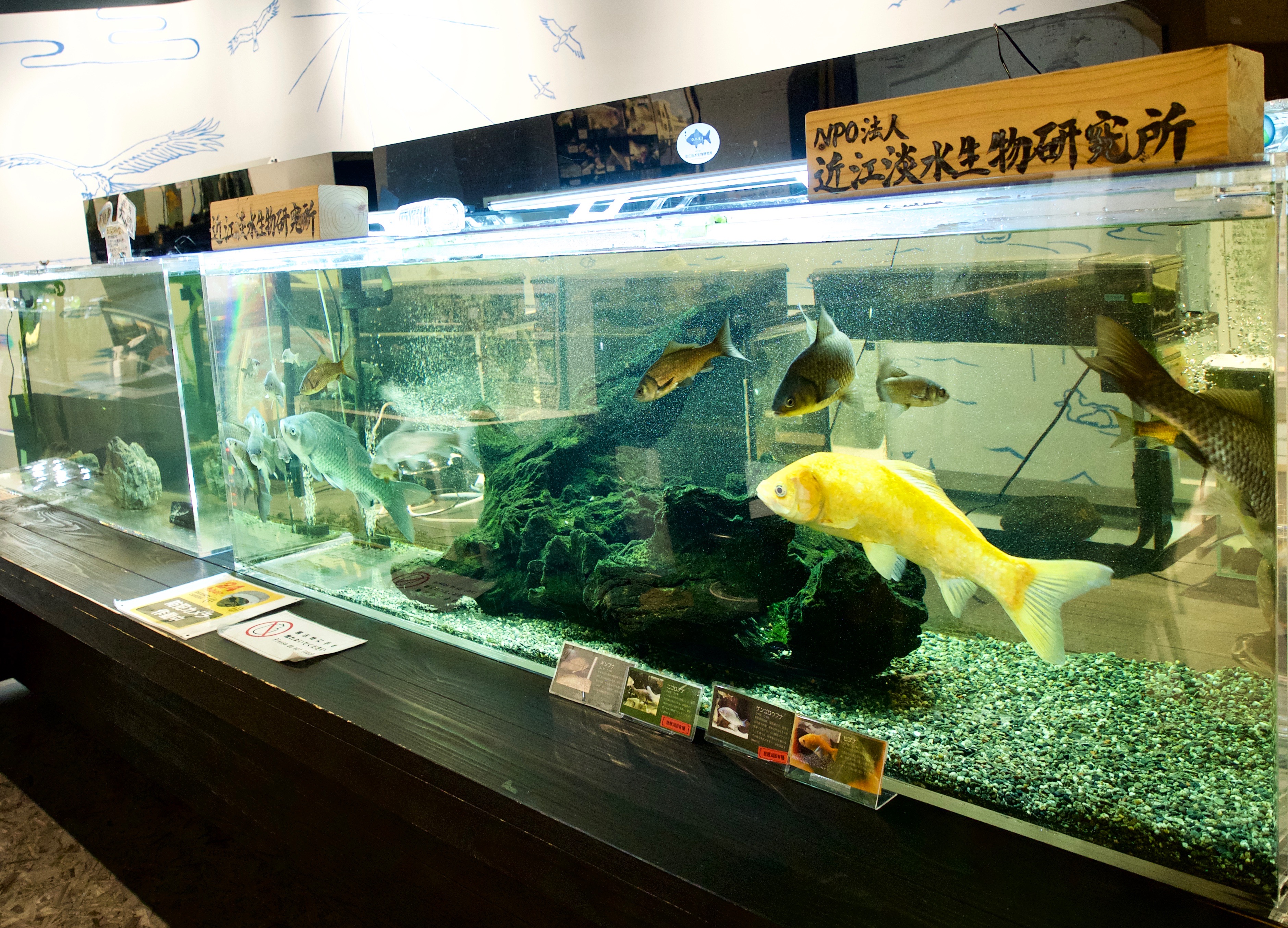 「小さな」水族館だからこそ水槽の間近でじっくり観察でき、イラストなどを添えた解説パネルを通じてわかりやすく学ぶことができます。市民団体「近江淡水生物研究所」の丁寧な管理で維持されており、生物多様性や環境問題を考えるきっかけにしてほしいとの思いが込められています。